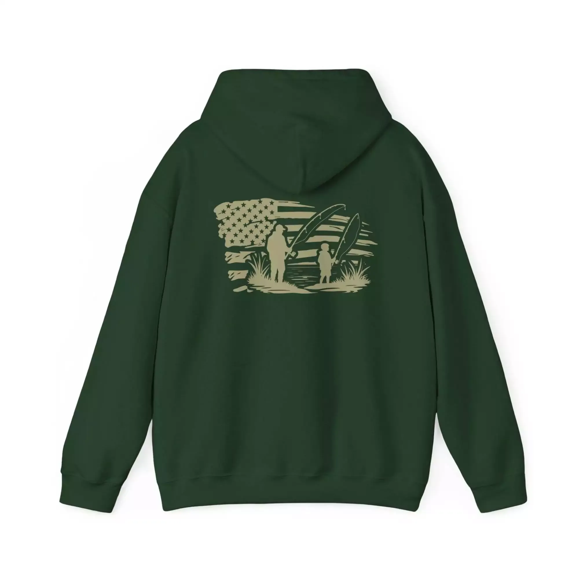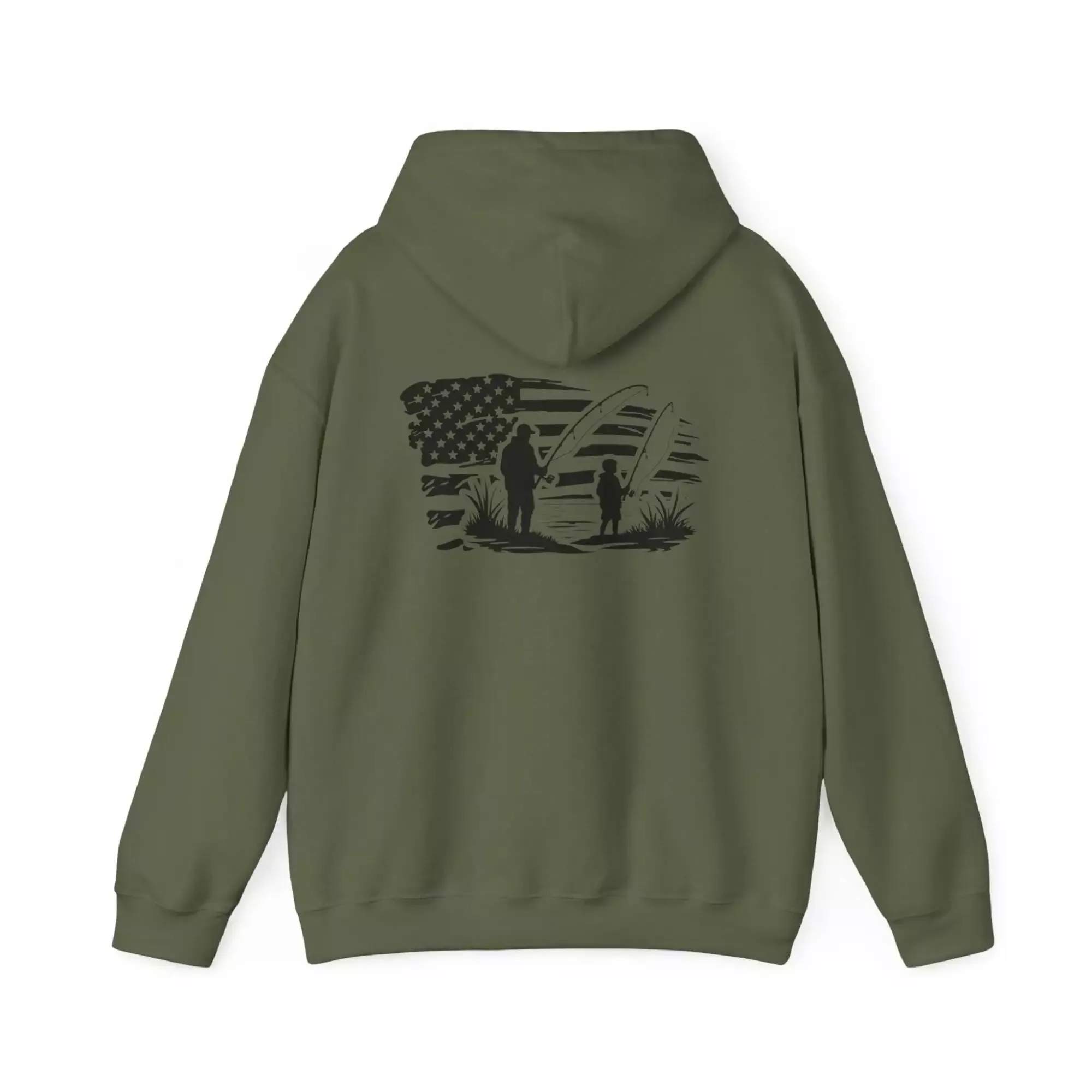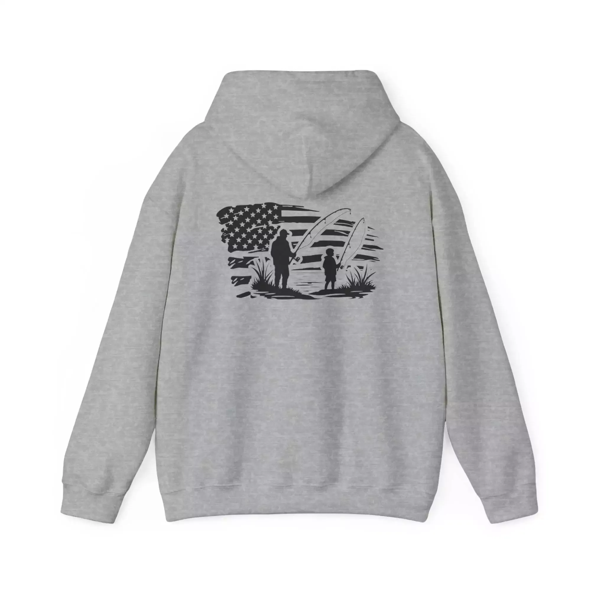 Stay warm and cozy with this Hooded Sweatshirt featuring a design of father and son fishing with a distressed US flag. Perfect for outdoor enthusiasts and patriotic individuals, this hoodie brings a comforting vibe and a touch of Americana to your wardrobe. Ideal for Father’s Day, Independence Day, and everyday casual wear.