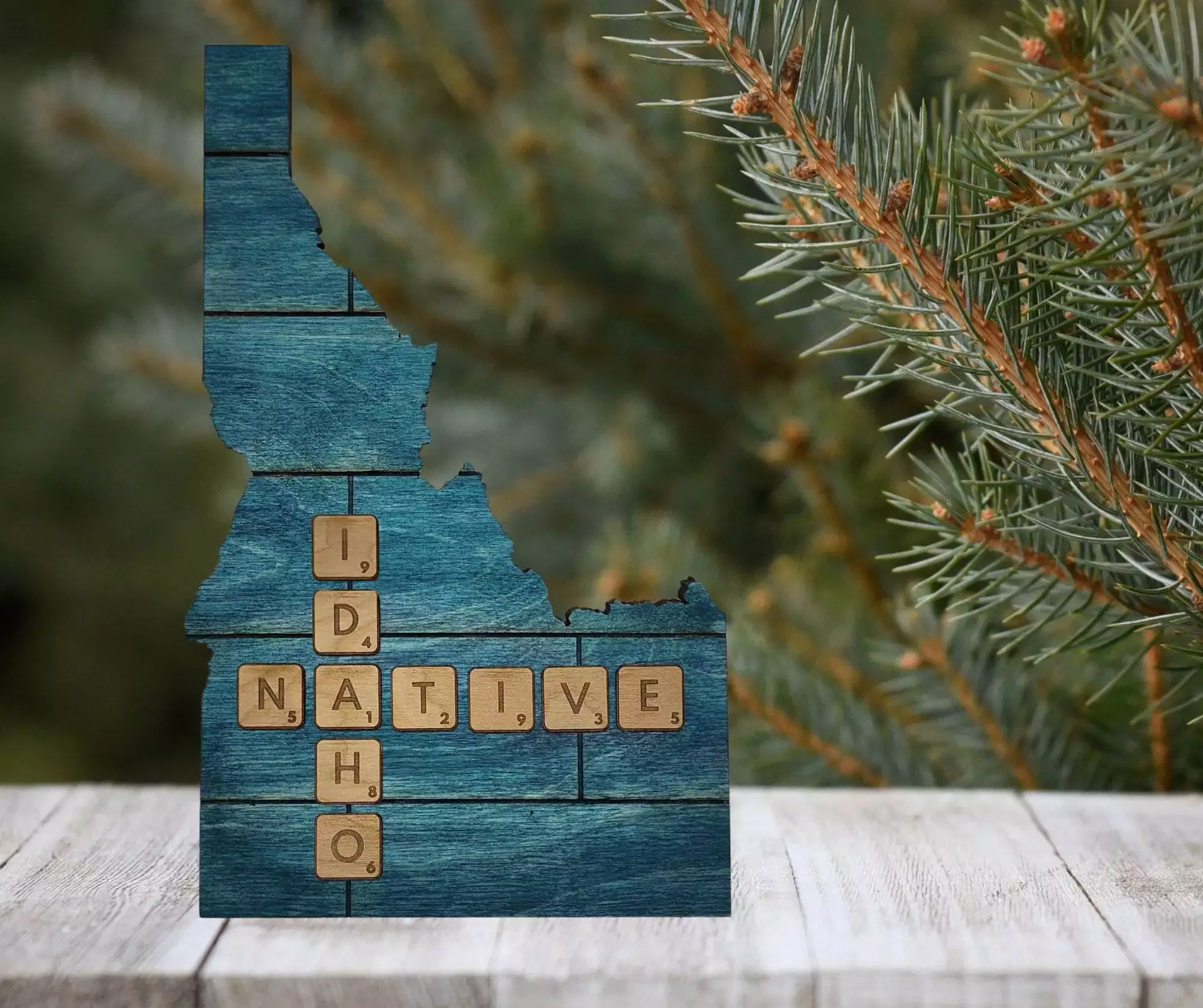 Idaho Native Accent | Rustic Laser Cut Wall & Table Decor | Unique Idaho Sign with Tile Letters for Home or Cabin Decor – Turquoise Stain – Faux Plank Engrave