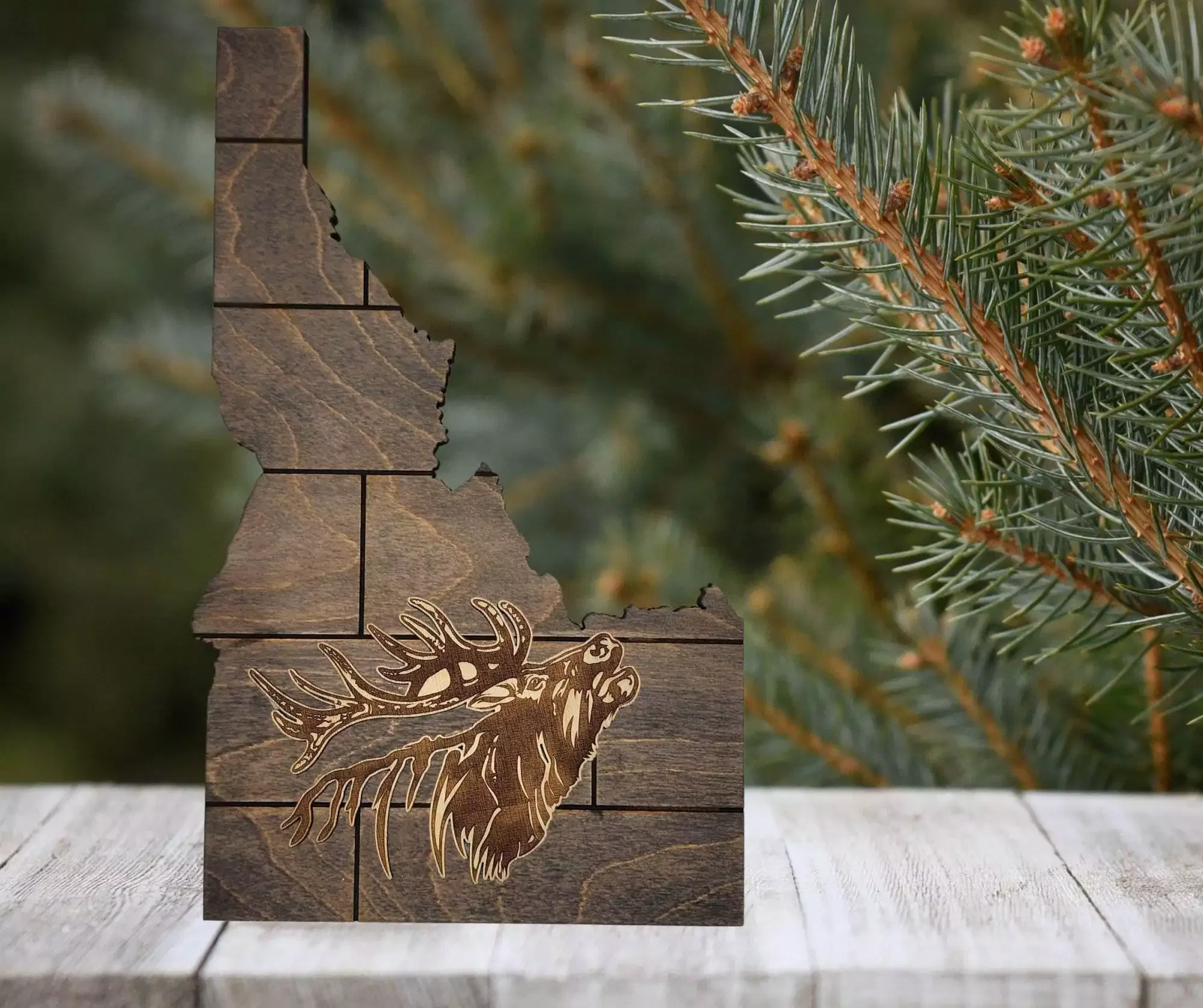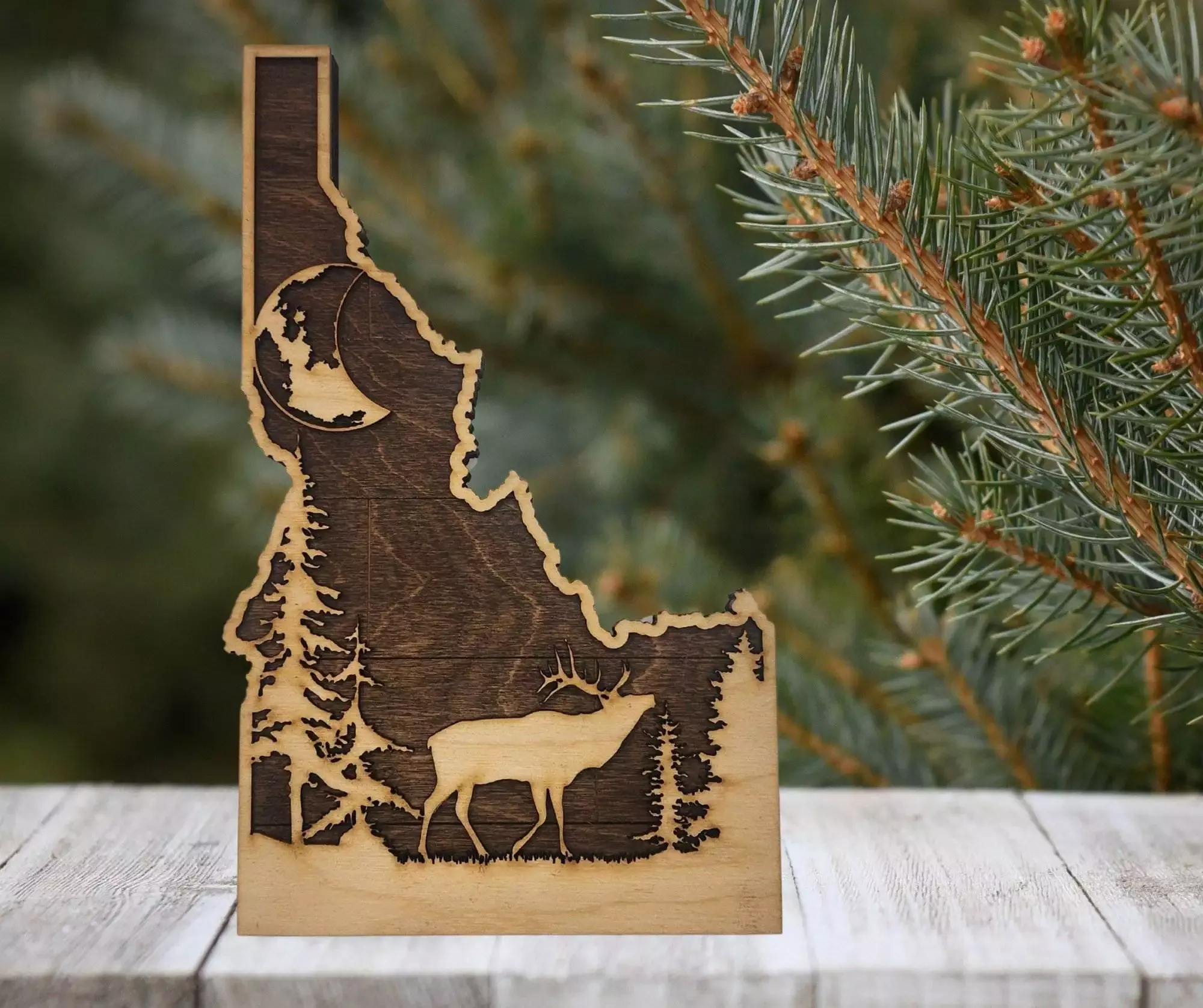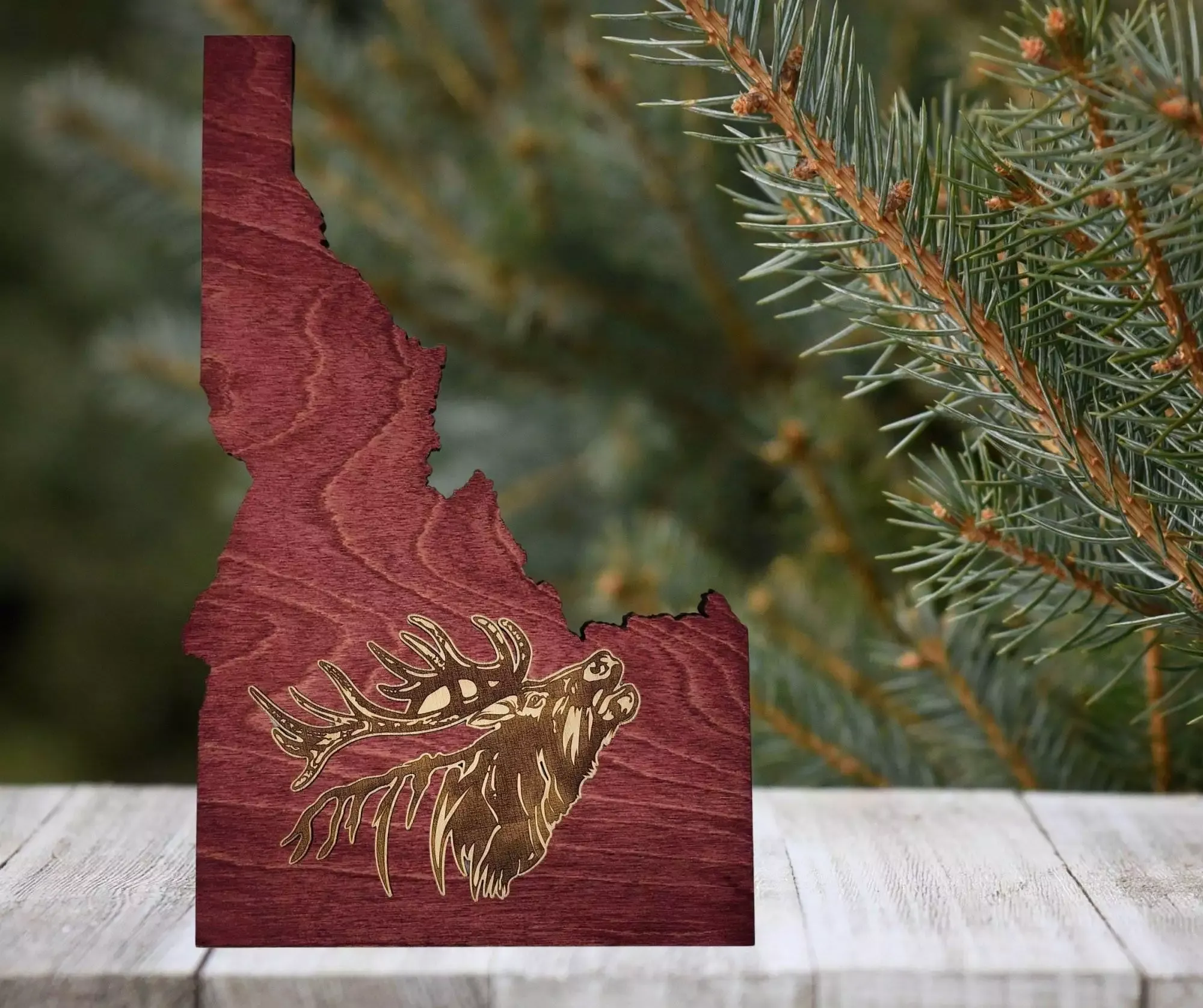 Transform your living space with our Rustic Idaho Home Accent, featuring an intricately laser-engraved elk head design that beautifully blends farmhouse charm with a touch of the wilderness. This unique decor piece is perfect for both wall and table displays, offering a striking focal point that speaks to the spirit of adventure and the beauty of nature, making it an ideal choice for enthusiasts of rustic home decor and Idaho-inspired art.